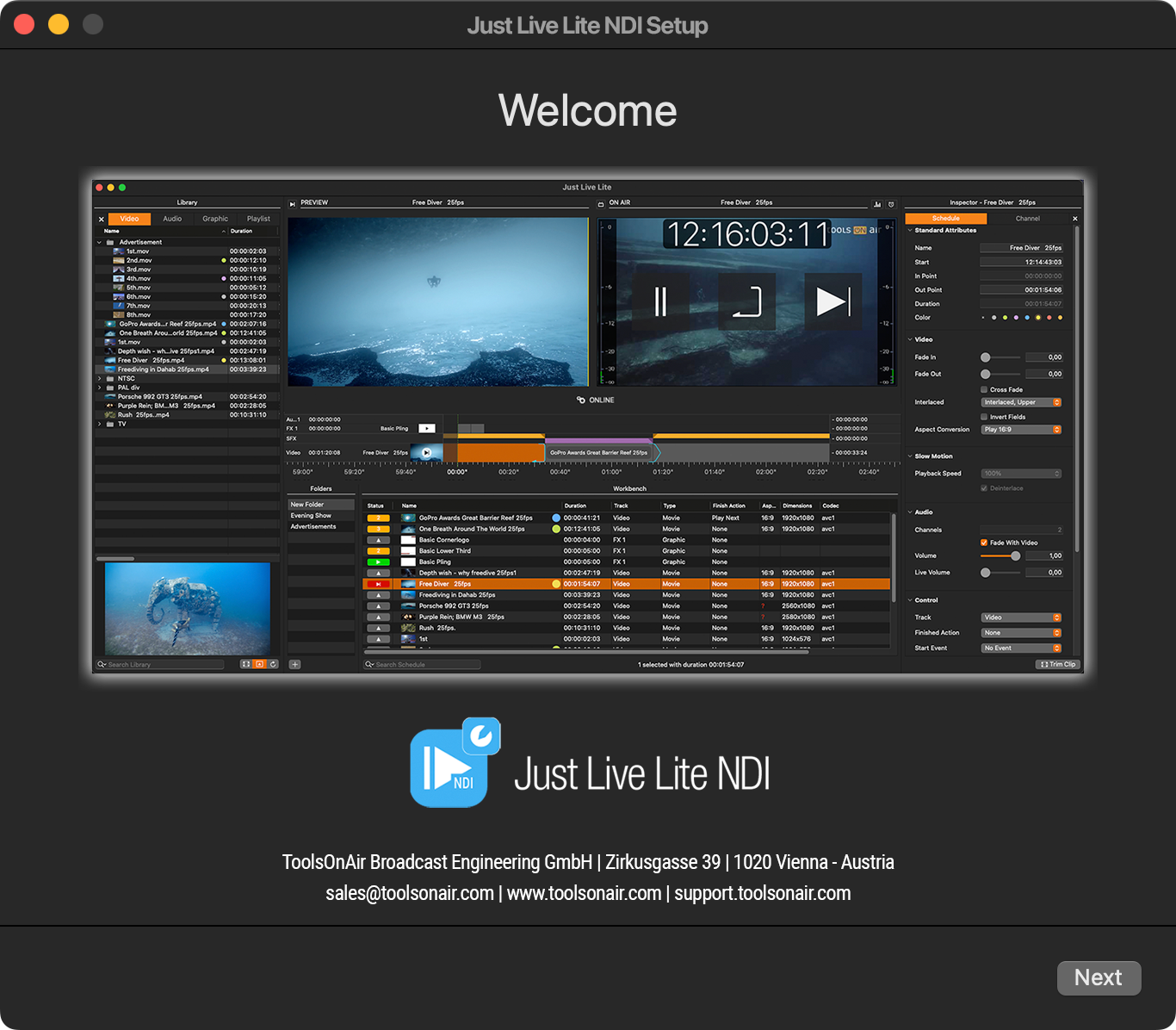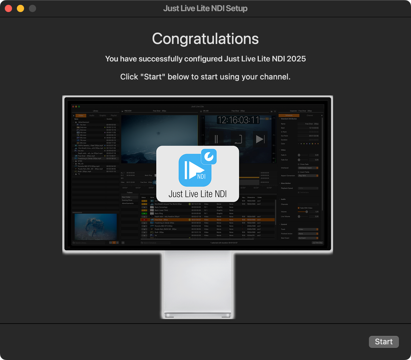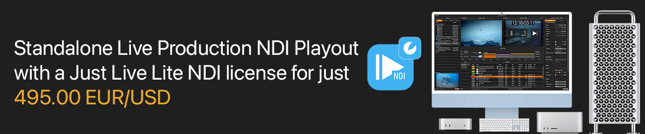 To run a watermark-free version of the Just Live Lite NDI application, please click on the “Purchase” button. The Just Live Lite NDI application sells for 495 EUR/USD and includes a 1-channel video and GFX playout license. This is a Software license only and does not include any Mac or video device hardware (to be purchased separately).