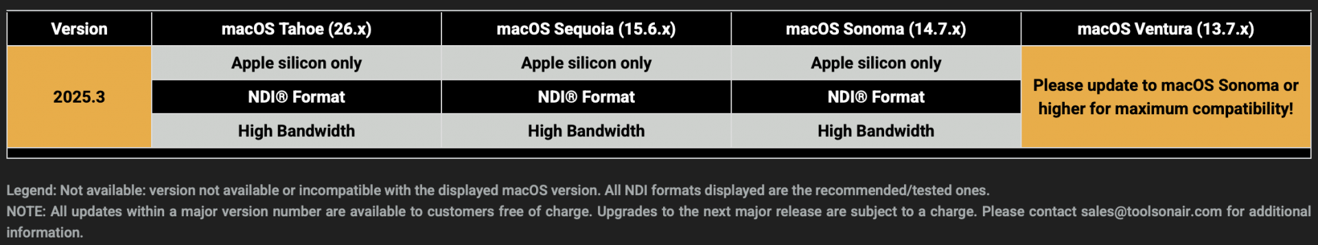 *Legend: 26.x = macOS Tahoe, 15.6.x = macOS Sequoia, 14.7.x = macOS Sonoma. macOS Sonoma and macOS Sequoia are the recommended OS versions for daily operations!