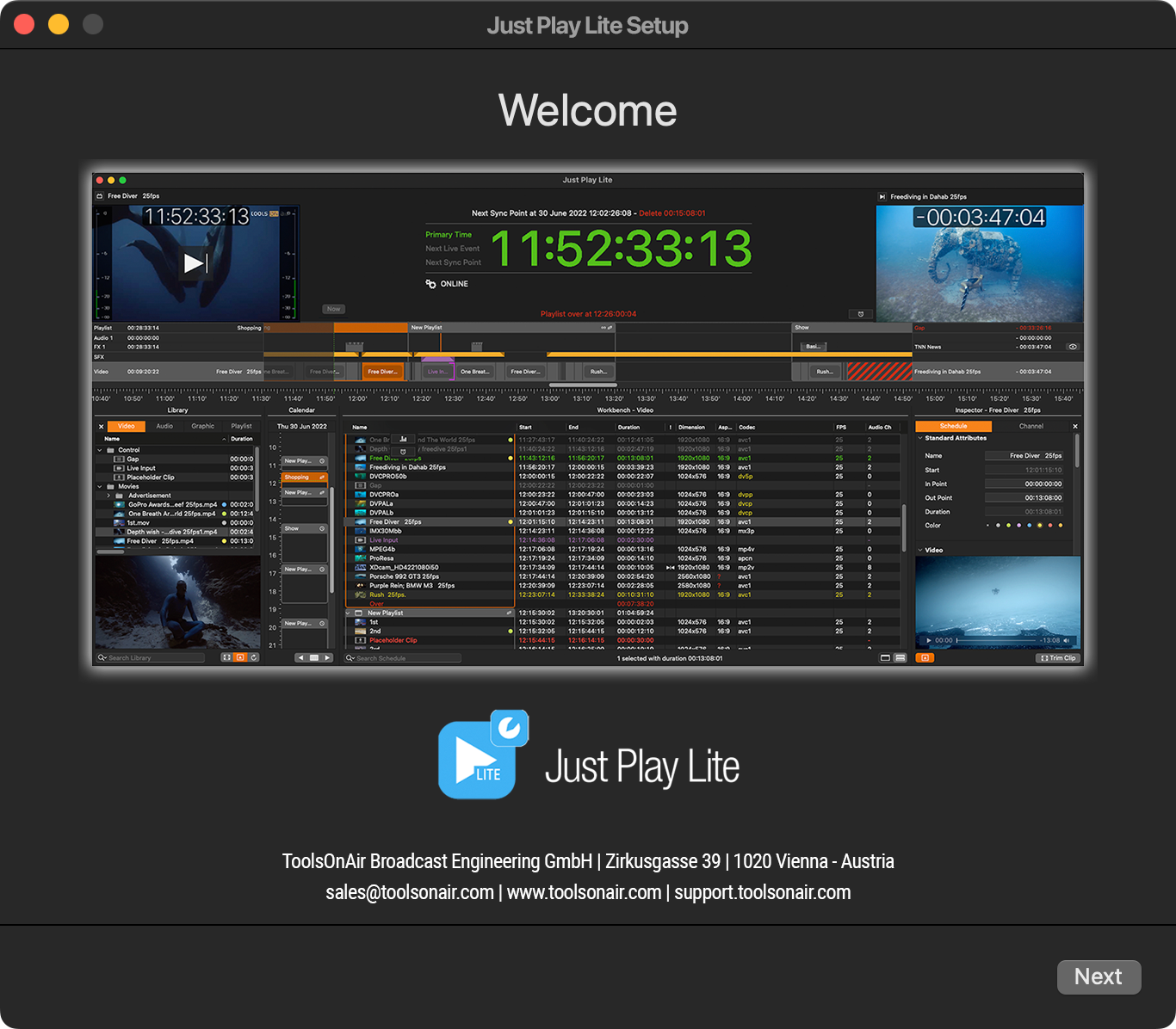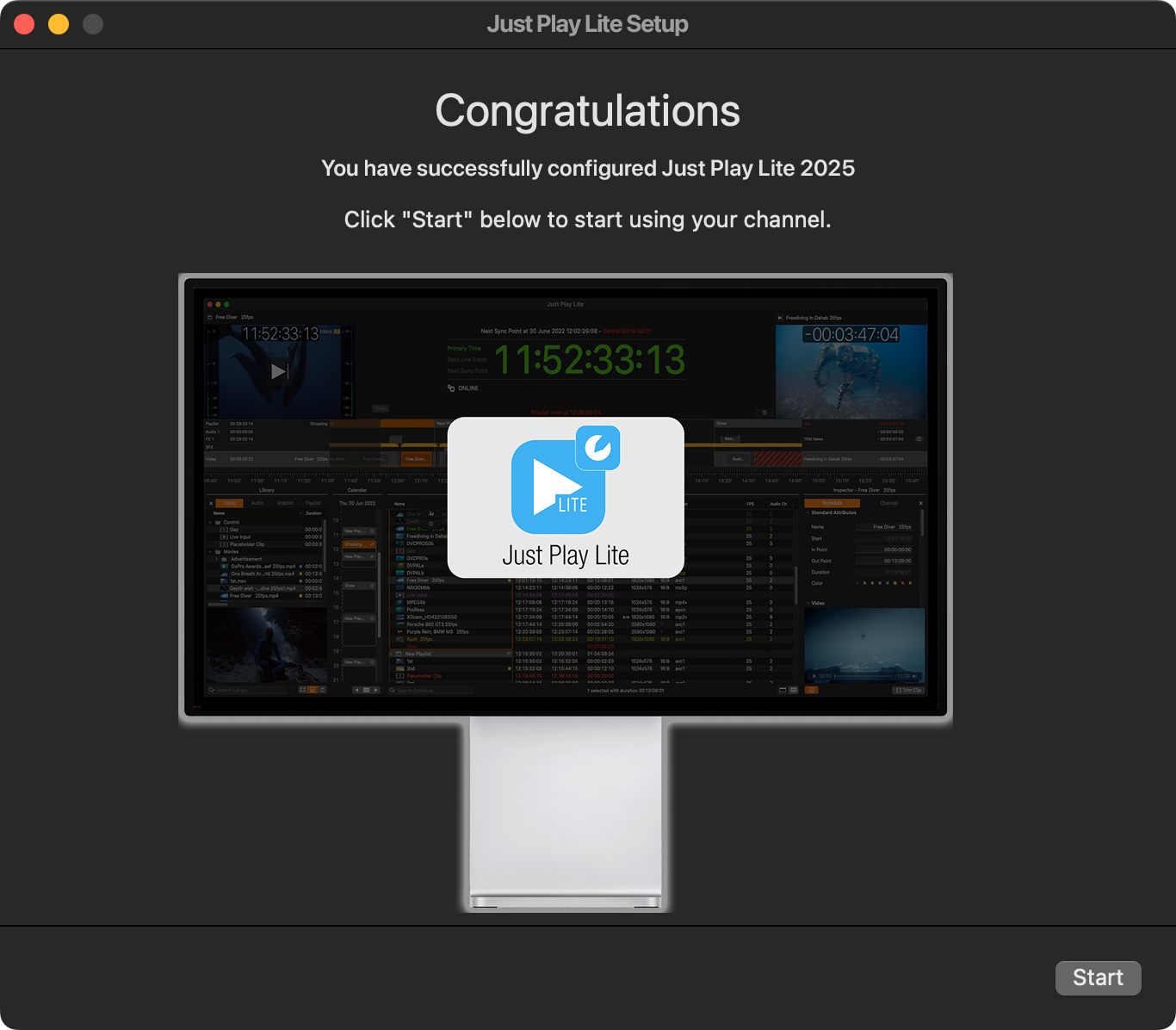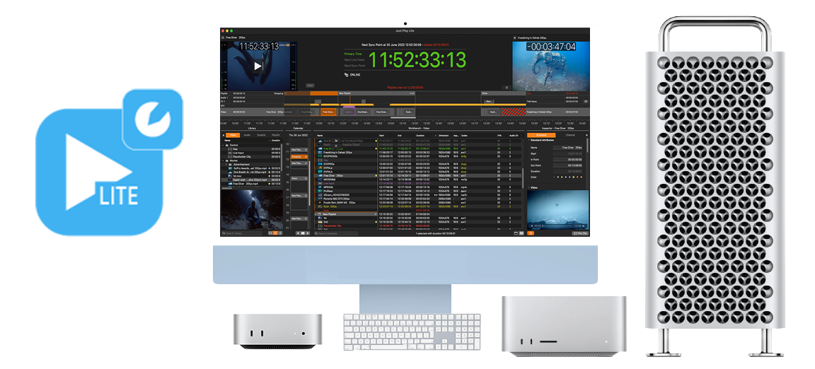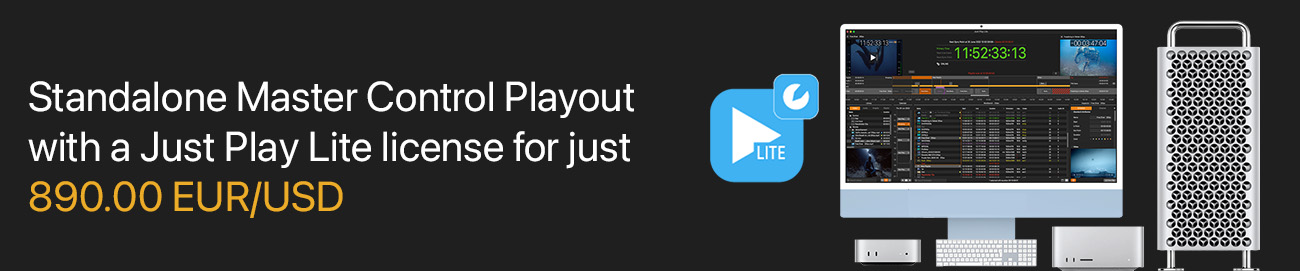 To run a watermark-free version of the Just Play Lite application, please click on the “Purchase” button. The Just Play Lite application sells for 890 EUR/USD and includes a 1-channel video and GFX playout license. This is a Software license only and does not include any Mac or video device hardware (to be purchased separately).